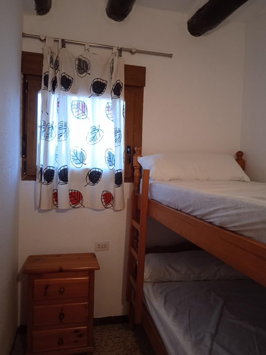 En el primer piso hay un dormitorio con una cama de 150 cm y dos dormitorios pequeños con literas y una gran terraza.